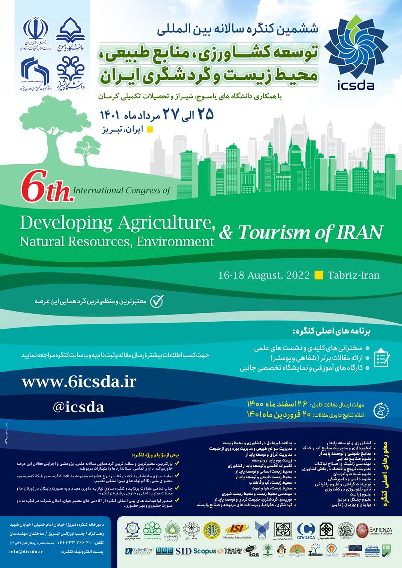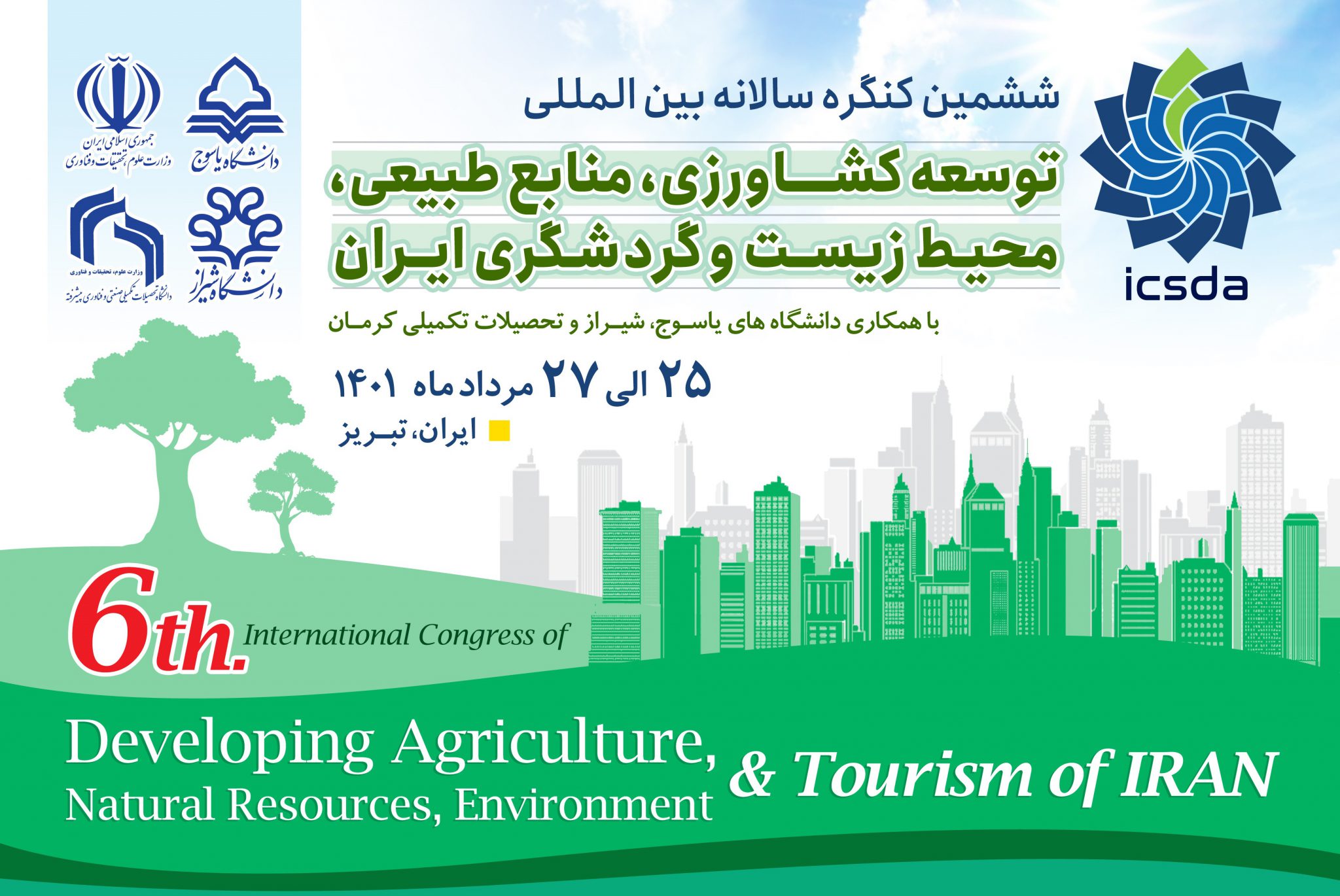 ششمین کنگره بین المللی توسعه کشاورزی، منابع طبیعی، محیط زیست و گردشگری ایران در تاریخ ۲۵ مرداد ۱۴۰۱ توسط دانشگاه یاسوج، دانشگاه شیراز، دانشگاه تحصیلات تکمیلی صنعتی و فناوری پیشرفته،دبیرخانه دائمی کنگره با همکاری برگزار خواهد شد.