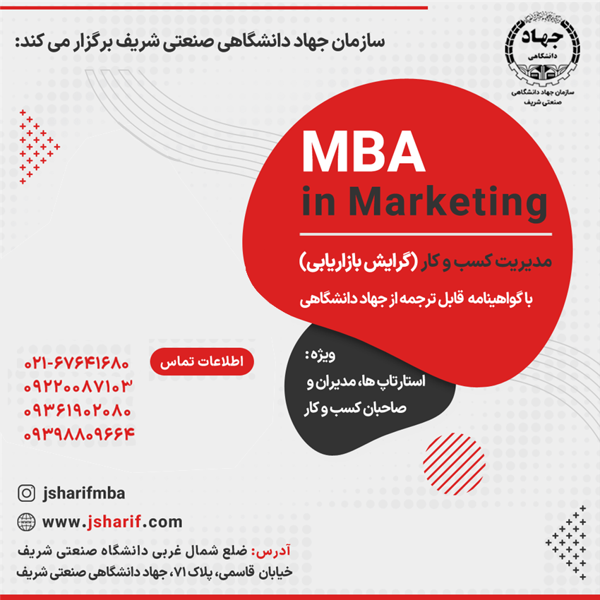معاونت آموزش سازمان جهاددانشگاهی صنعتی شریف، دومین دوره مدیریت کسب و کار با گرایش بازاریابی – MBA in Marketing را در اردیبهشت ماه سال 1401 به صورت الکترونیکی(آنلاین) برگزار می کند.