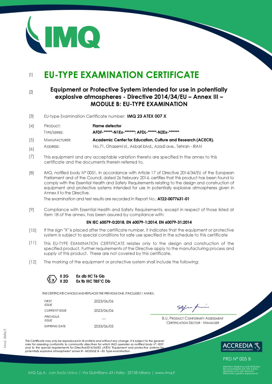 مرکز خدمات تخصصی اپتیک سازمان جهاددانشگاهی صنعتی شریف جهت ارتقای ضریب ایمنی شعله بین و اخذ گواهینامه ضد انفجار، طی عقد قراردادی با شرکت آزمایشگاه های صنایع انرژی (اپیل) موفق به دریافت گواهینامه بین المللی EU-Type Examination برای شعله بین های AFDF و AFDL ساخت این سازمان از شرکت IMQ کشور ایتالیا شد.