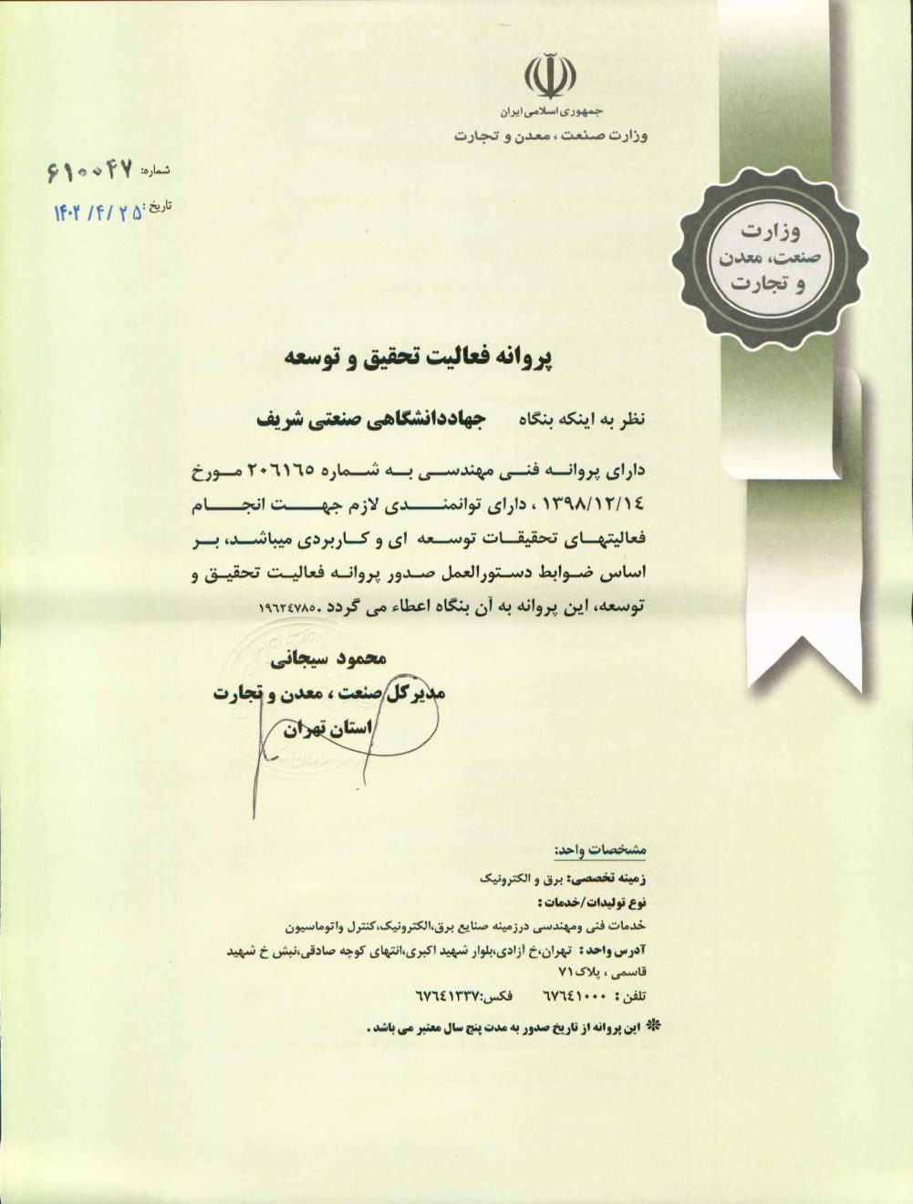این پروانه در زمینه تخصصی برق و الکترونیک و برای تولید و ارائه خدمات فنی و مهندسی در زمینه صنایع برق، الکترونیک، کنترل و اتوماسیون صادر شده است.