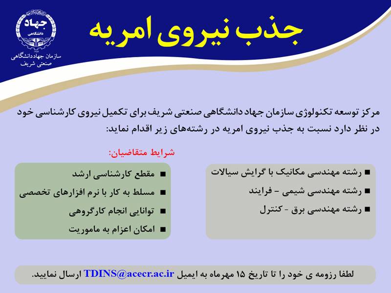 مرکز توسعه تکنولوژی سازمان جهاددانشگاهی صنعتی شریف برای تکمیل نیروی کارشناسی خود در نظر دارد نسبت به جذب نیروی امریه در رشتههای زیر اقدام نماید: