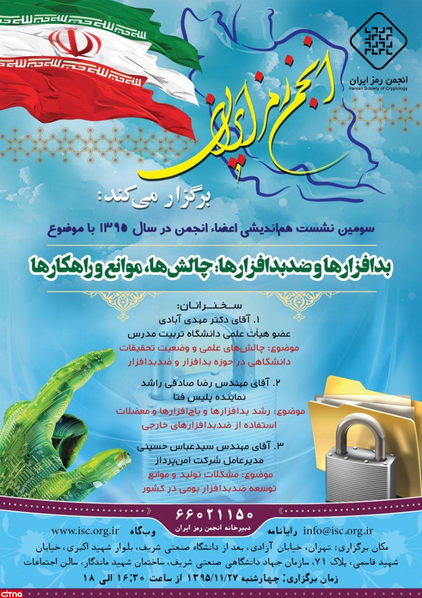سومین نشست هم اندیشی انجمن رمز ایران در سال ۹۵ با موضوع «بدافزارها و ضدبدافزارها، چالش ها، موانع و راهکارها» روز ۲۷ بهمن ماه جاری، ساعت ۱۶:۳۰ تا ۱۸ با حضور اعضای حقیقی و حقوقی انجمن، اساتید و محققین دانشگاه و فعالان صنعت افتا برگزار می شود.